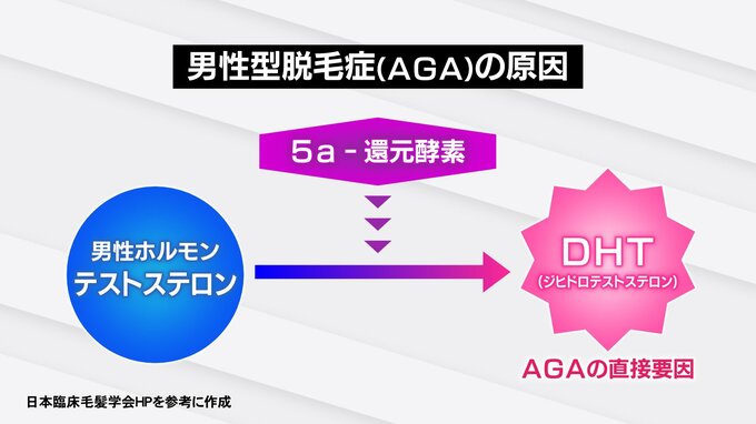 まず、男性ホルモン(テストステロン)は、身体の中で「5α還元酵素」によって「DHT(ジヒドロテストステロン)」という別の物質に作り替えられます。