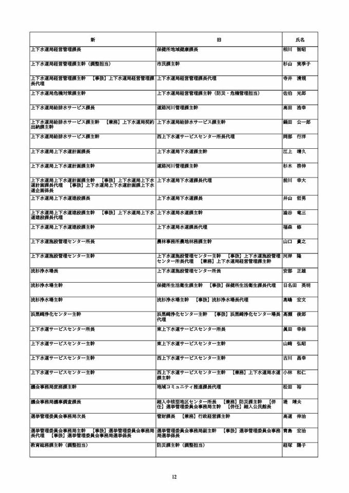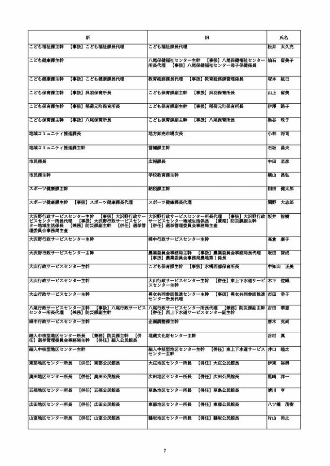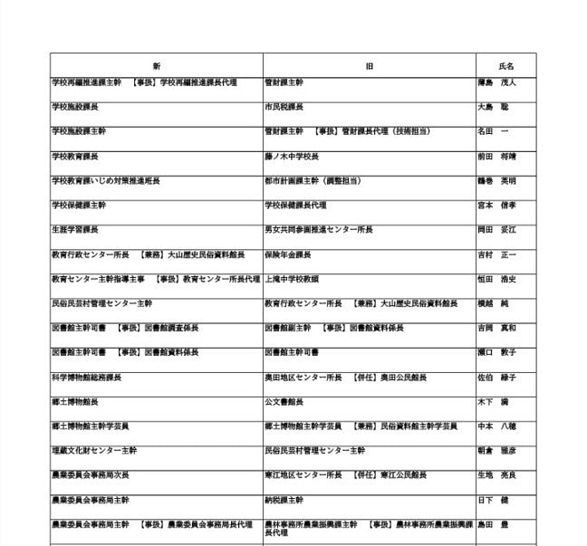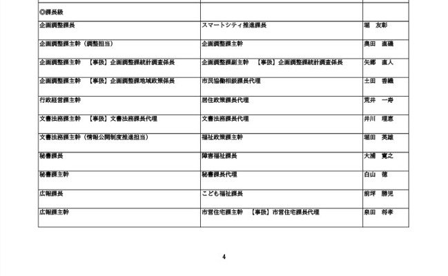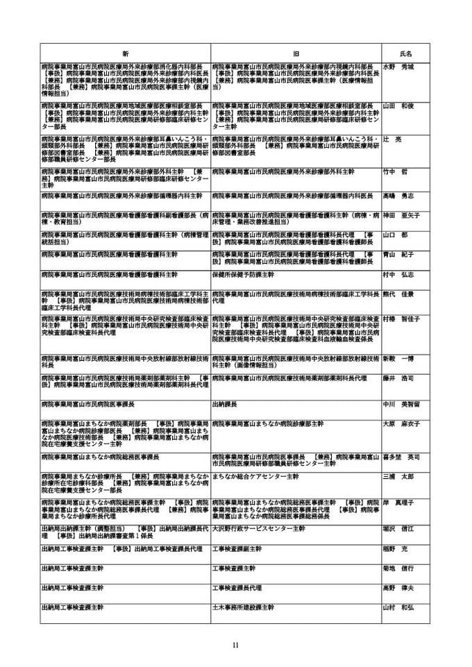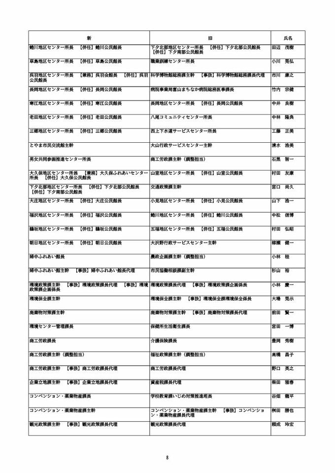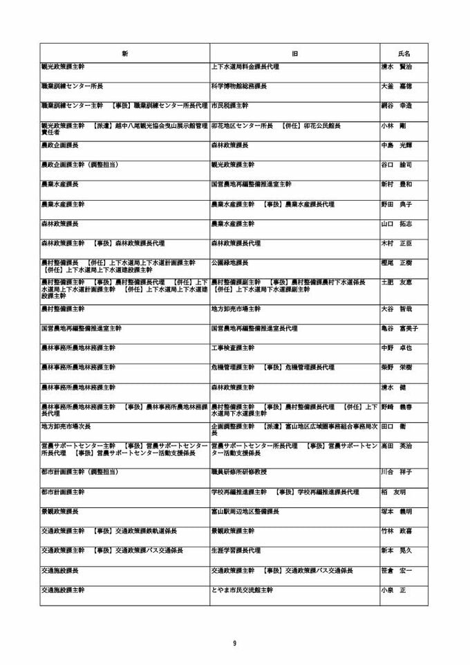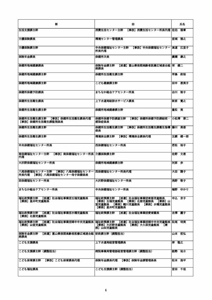 ニュースクリップ 【富山市職員 2026人事異動 】DX推進体制、空き家対策を強化 課長級以上の女性比率20.4%、係長級以上では49.0%で市町村合併後 最高【一覧 4月1日発令】 2026年3月30日(月) 10:50 国内 富山市・課長級 人事異動2026 ■富山市・部長級、部次長級 ■富山市・課長級、課長代理級 ■富山市・係長級 ■富山市・一般職員(主任、技能職員等) ■富山市・消防局(役付異動のみ)