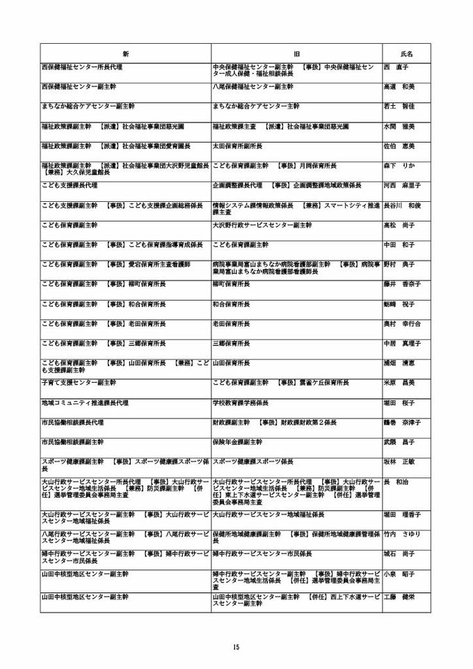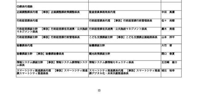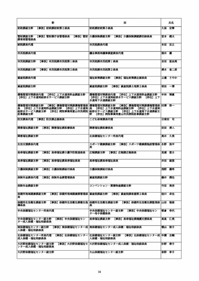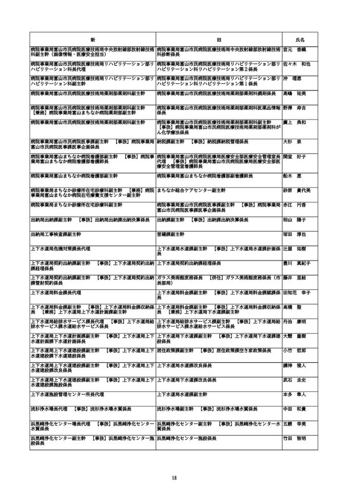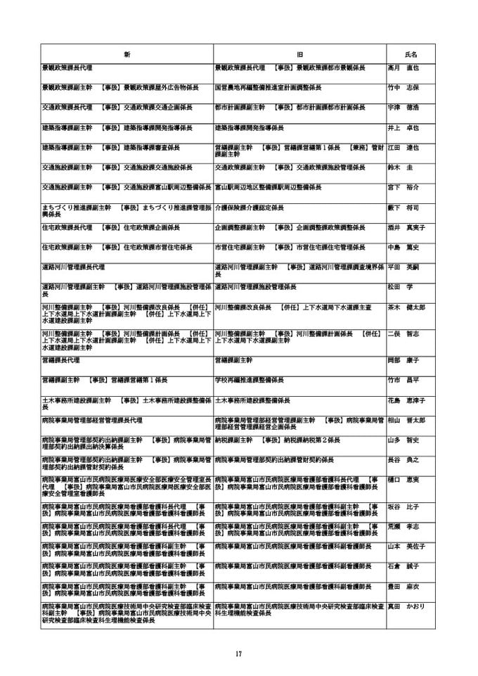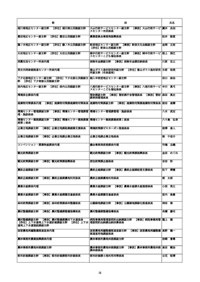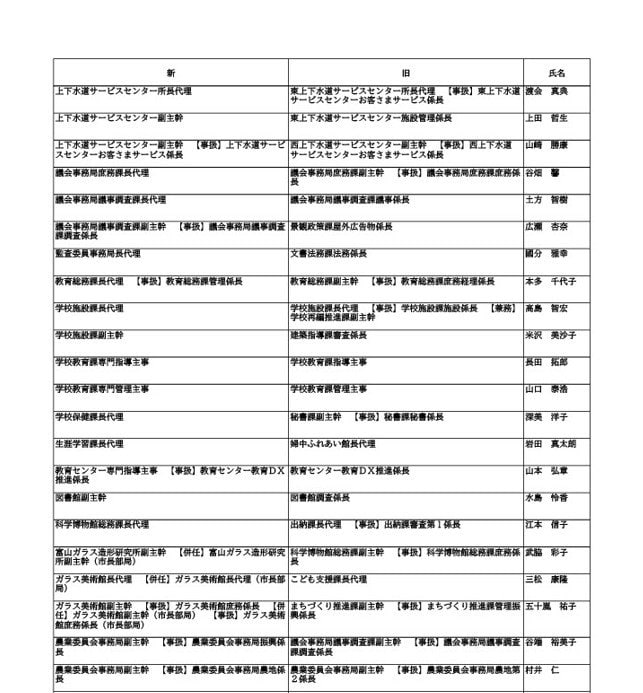 ニュースクリップ 【富山市職員 2026人事異動 】DX推進体制、空き家対策を強化 課長級以上の女性比率20.4%、係長級以上では49.0%で市町村合併後 最高【一覧 4月1日発令】 2026年3月30日(月) 10:50 国内 富山市・課長代理級 人事異動2026 ■富山市・部長級、部次長級 ■富山市・課長級、課長代理級 ■富山市・係長級 ■富山市・一般職員(主任、技能職員等) ■富山市・消防局(役付異動のみ)