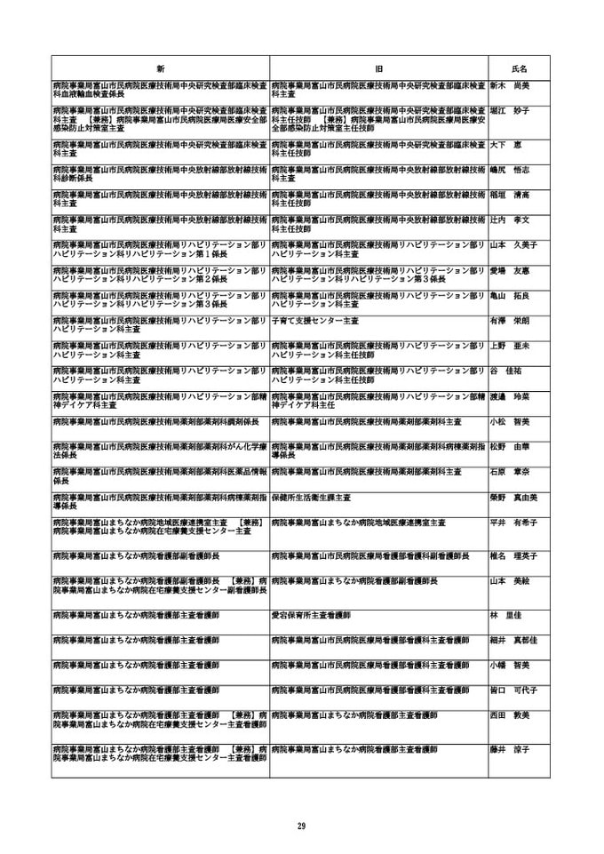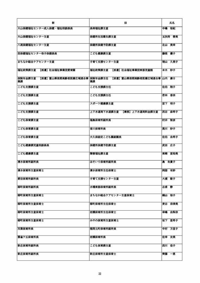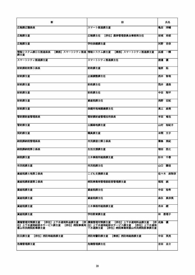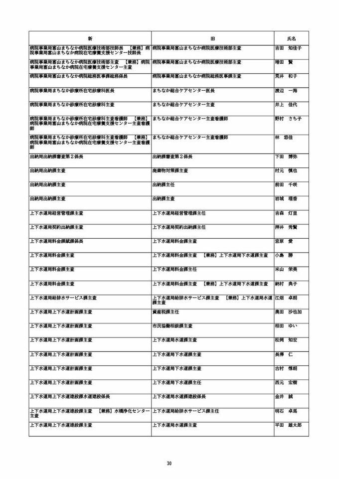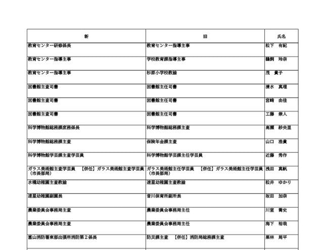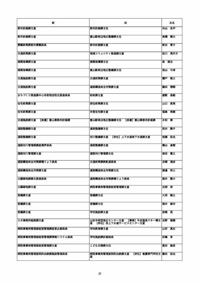ニュースクリップ 【富山市職員 2026人事異動 】DX推進体制、空き家対策を強化 課長級以上の女性比率20.4%、係長級以上では49.0%で市町村合併後 最高【一覧 4月1日発令】 2026年3月30日(月) 10:50 国内 富山市・係長級 人事異動2026 ■富山市・部長級、部次長級 ■富山市・課長級、課長代理級 ■富山市・係長級 ■富山市・一般職員(主任、技能職員等) ■富山市・消防局(役付異動のみ)