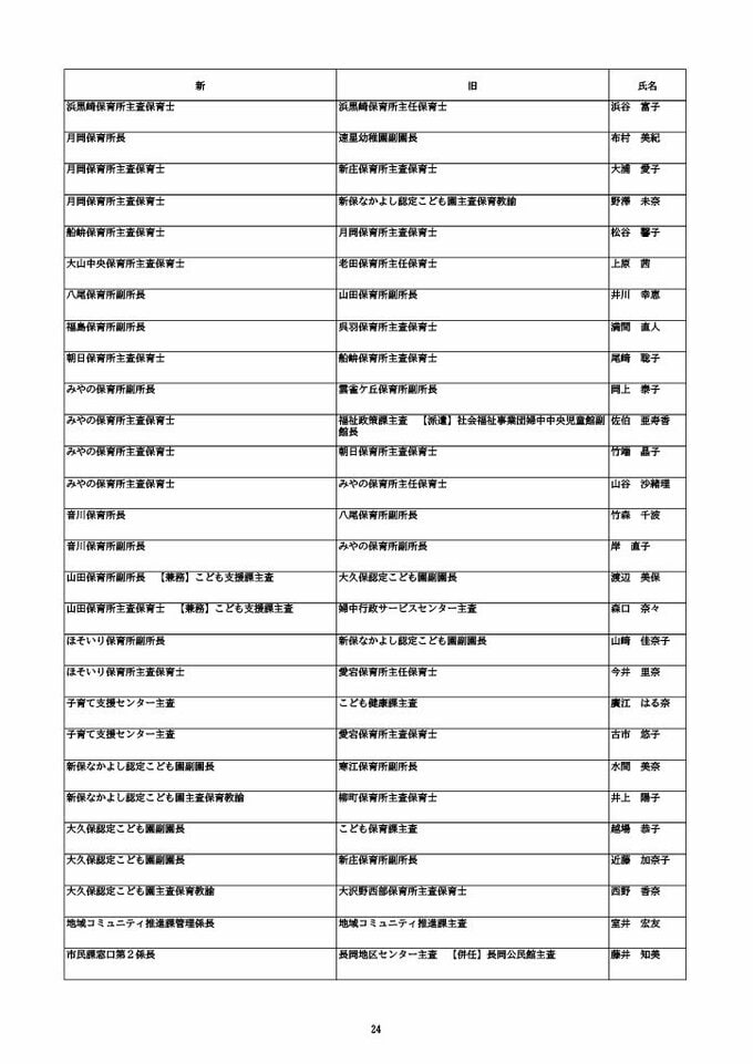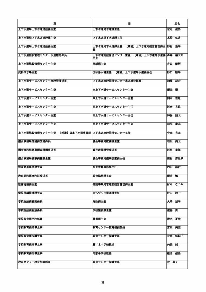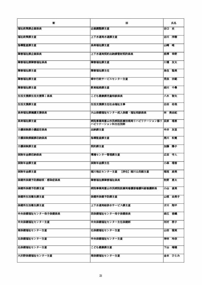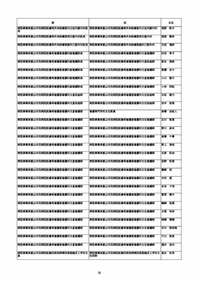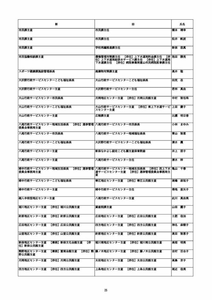 ニュースクリップ 【富山市職員 2026人事異動 】DX推進体制、空き家対策を強化 課長級以上の女性比率20.4%、係長級以上では49.0%で市町村合併後 最高【一覧 4月1日発令】 2026年3月30日(月) 10:50 国内 富山市・係長級 人事異動2026 ■富山市・部長級、部次長級 ■富山市・課長級、課長代理級 ■富山市・係長級 ■富山市・一般職員(主任、技能職員等) ■富山市・消防局(役付異動のみ)