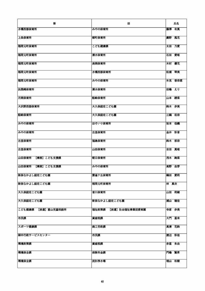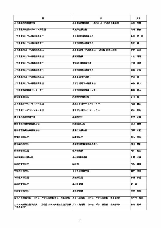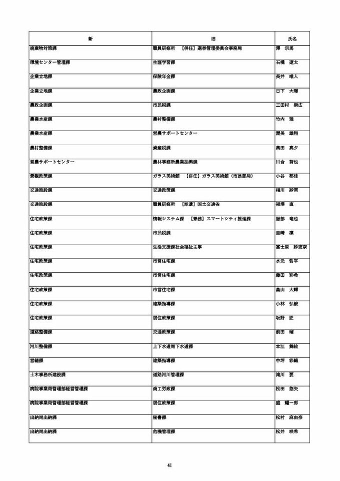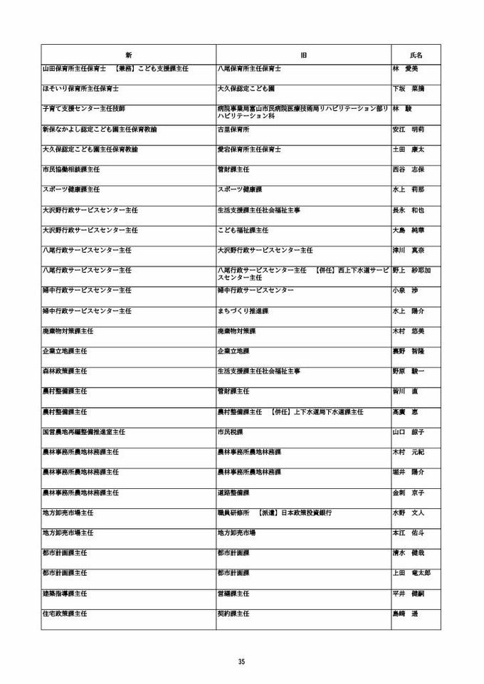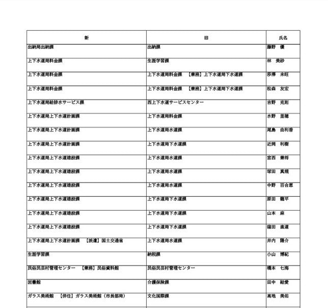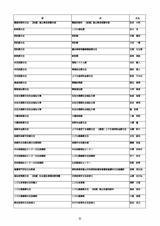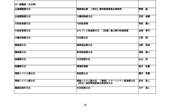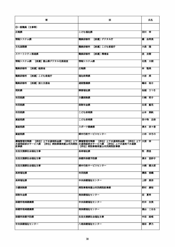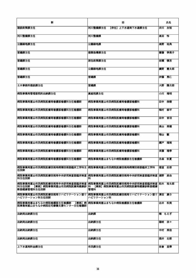 ニュースクリップ 【富山市職員 2026人事異動 】DX推進体制、空き家対策を強化 課長級以上の女性比率20.4%、係長級以上では49.0%で市町村合併後 最高【一覧 4月1日発令】 2026年3月30日(月) 10:50 国内 富山市・一般職員(主任等)人事異動2026 ■富山市・部長級、部次長級 ■富山市・課長級、課長代理級 ■富山市・係長級 ■富山市・一般職員(主任、技能職員等) ■富山市・消防局(役付異動のみ)