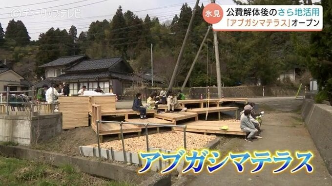 能登半島地震で多くの建物が倒壊した富山県氷見市で、公費解体後の更地を活用した「アブガシマテラス」が完成し29日、オープニングセレモニーが行われました。