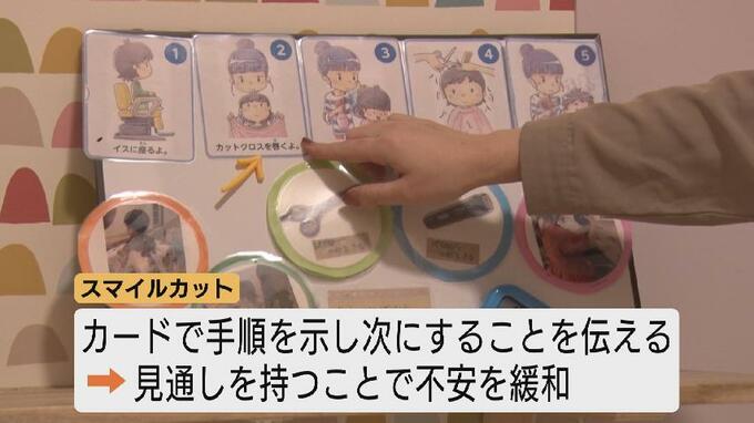 スマイルカットではカードなどで手順を示し、次に何をするのかを伝えます。