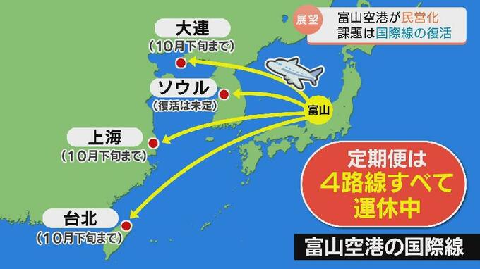 現在、富山空港では大連、ソウル、上海、台北の、4つの国際線の定期便すべてが運休。大連、上海、台北便はことし10月下旬まで運休が決まっていて、ソウル便は復活の見通しが立っていません。