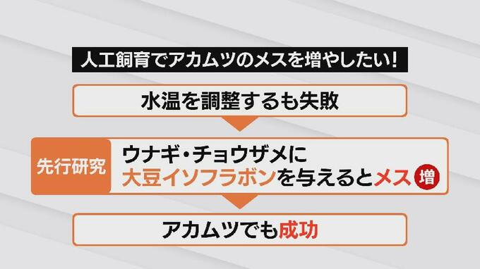 メスを増やす研究については、まずは水温を調整しましたが、この方法ではメスは増えず。ウナギやチョウザメに大豆イソフラボンを与えるとメスが増えたという先行研究を参考に、アカムツにも試したところ成功したそうです。