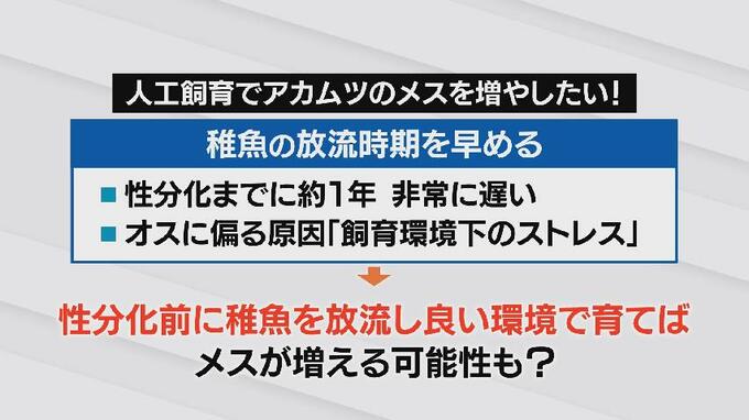 こうした背景から、アカムツが性分化する前に稚魚を放流して、天然の、良い環境で育てばメスが増える可能性もあるのではないかと話していました。