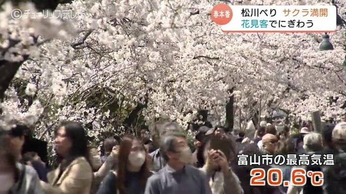 富山市の「松川べり」のサクラ満開 ”花金”で花見客がいっぱい 春の日差しのもとサクラに酔いしれる 2026年4月3日(金) 19:46 国内 3日の富山県内は久しぶりに朝からすっきりとした青空が広がりました。最高気温も各地で20℃前後と春本番のあたたかさとなりました。県内各地では桜が見ごろを迎え、花見客でにぎわいました。橋本星奈「松川べりの…