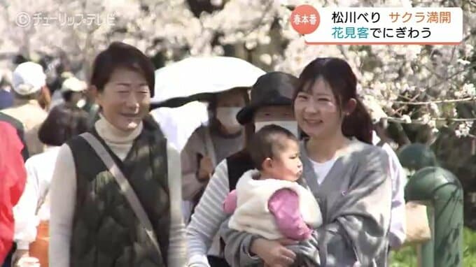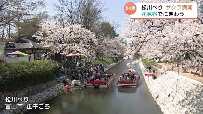この陽気で富山市の松川べりでは多くの家族連れなどが、満開のサクラを楽しんでいました。