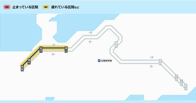 JR西日本金沢支社によりますと、迂回運転の対象は特急列車9本です。下り(大阪・新大阪・京都発、敦賀方面行き)は、大阪発10時42分の17号から同13時12分の25号までの5本で、敦賀駅到着に約30分の遅れが生じています。