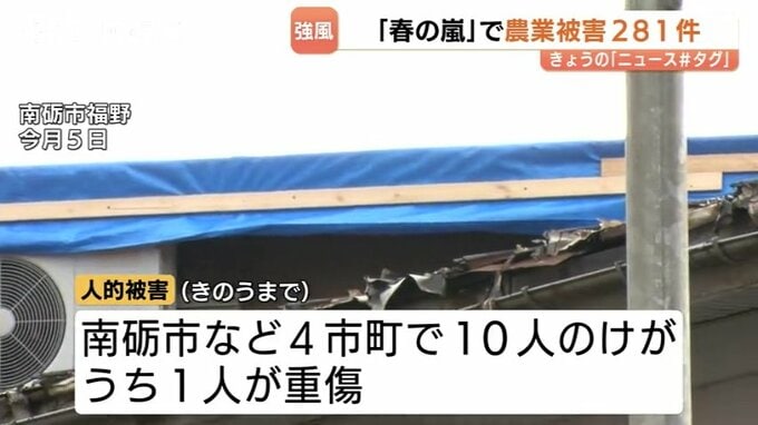 ニュースクリップ “春の嵐” 8市町村で農業被害 281件、1人重傷、ビニールハウス破損256件のほかトタン剥がれも 富山 2026年4月8日(水) 20:17 国内 暮らし・マネー 今月4日に富山県内を襲った「春の嵐」で、強風による農業被害が8つの市町村で281件に上ったことが分かりました。富山県によりますと、富山市や南砺市など8市町村でビニールハウスの破損が256件、富山市や立山町など…