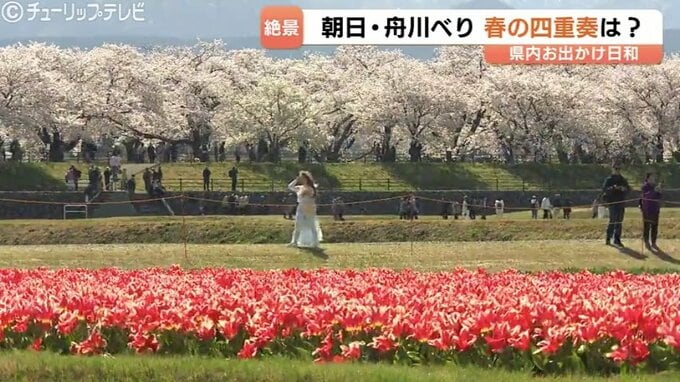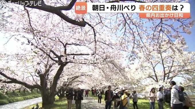 お出かけ日和となった8日、朝日町の観光名所、舟川べりに行ってきました。春の四重奏となったのでしょうか。