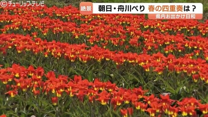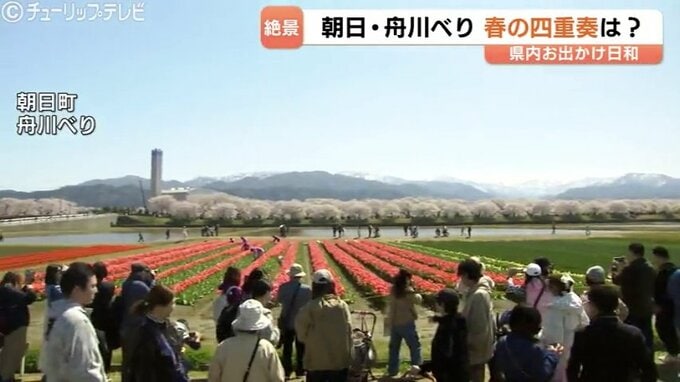 春は雪化粧した北アルプスを背景にサクラ、チューリップ、菜の花の開花時期がそろう「春の四重奏」が最大の見どころです。