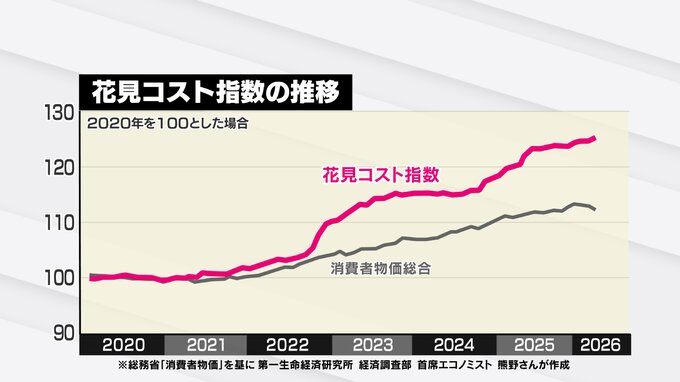総務省の「消費者物価」を元に第一生命経済研究所のエコノミストが作成した「花見コスト指数」では年々コスト指数上がっていて、2020年から比べると25%上昇しています。