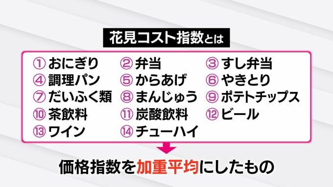 花見指数とはお花見で持っていく代表的な食べ物と飲み物、「おにぎり」「弁当」「すし弁当」「調理パン」「からあげ」「やきとり」「だいふく類」「まんじゅう」「ポテトチップス」「茶飲料」「炭酸飲料」「ビール」「ワイン」「チューハイ」の14種類を選び、その価格指数を加重平均したものです。