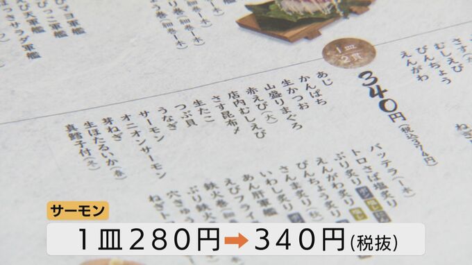 サーモンは1皿280円から340円(税抜)の価格帯に上がりました。