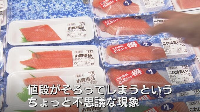 「トラウトサーモン(チリ産)よりも、本来アトランティックサーモン(国産)の方が、高くて当然なんですけど。(国産を)めちゃめちゃ安く売っているので、値段がそろってしまうというちょっと不思議な現象になっています」