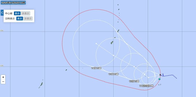 ▼14日(火)午後3時の予報でも「非常に強い」勢力を維持したまま、マリアナ諸島付近を北西に時速15kmで進む見通しです。中心気圧は935hPaまでさらに低下し、最大瞬間風速は65m/sに達すると予測されています。