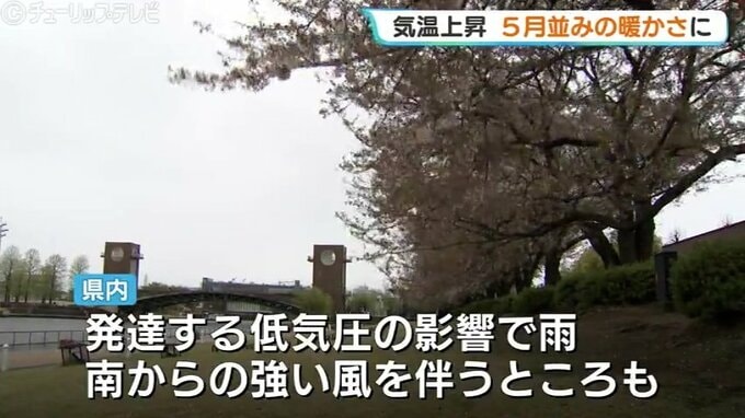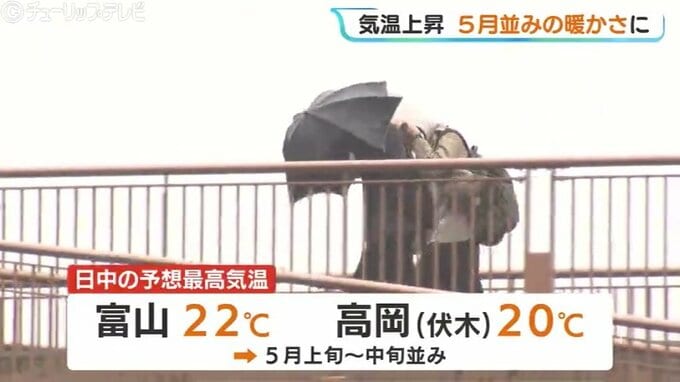 気温はさらに上がる見込みで、日中の予想最高気温は富山で22℃、高岡市伏木で20℃と、5月上旬から中旬並みのあたたかさとなりそうです。