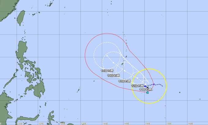 台風4号は、14日(火)から15日(水)にかけても「非常に強い」勢力を維持したまま、マリアナ諸島付近を北西にゆっくりと進む見通しです。15日午後3時時点でも中心気圧は920hPa、最大風速50m/sが見込まれています。