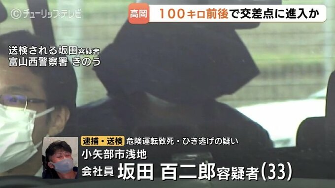 危険運転致死とひき逃げの疑いで逮捕・送検されたのは、富山県小矢部市浅地の会社員、坂田百二郎容疑者(33)です。