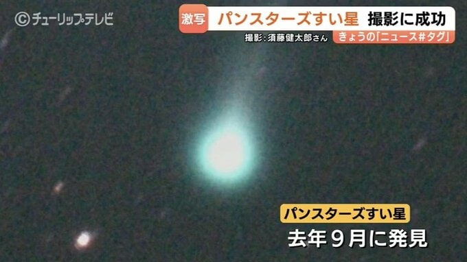 「パンスターズ彗星」富山で撮影に成功!発見されたばかりの貴重な姿 最も観察しやすい時期は…今月15日から20日ごろの明け方 2026年4月10日(金) 20:27 国内 富山市で新しい彗星「パンスターズ彗星」が撮影されました。これは、9日 午前3時半過ぎ、富山市の殿様林緑地公園の土手で、県天文学会の須藤健太郎さんが撮影した「パンスターズ彗星」の写真です。「パンスターズ…