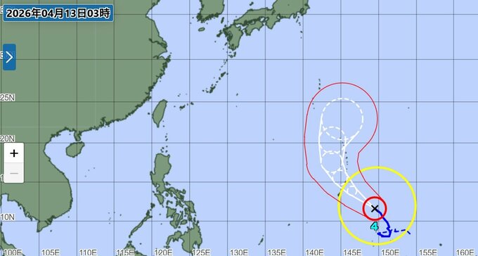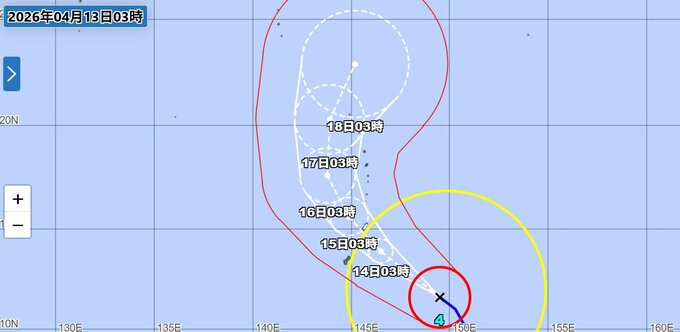 ▼ 18日(土)午前3時:小笠原近海を時速15kmで北北東に進む予報です。中心気圧は965hPa、最大風速は35m/sまで弱まりますが、「強い」勢力を保っています。予報円の半径は280kmと大きく広がっており、進路の不確実性が高まっています。