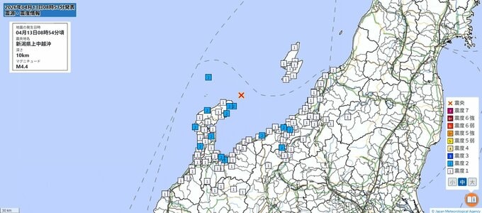 気象庁によりますと、震源地は新潟県上中越沖で、震源の深さは約10キロ、地震の規模を示すマグニチュードは4.4と推定されます。