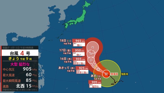 気象庁によりますと、台風4号は13日午前9時現在、マリアナ諸島(北緯12.2度、東経148.8度)にあり、時速15kmで北西に進んでいます。中心気圧は905hPa、中心付近の最大風速は60m/s、最大瞬間風速は85m/sと、非常に危険な勢力です。