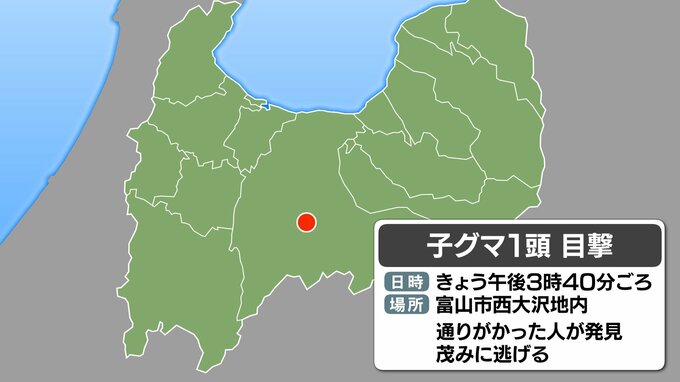 ニュースクリップ 【クマ情報】住宅地近くの道路で子グマ1頭 防災無線で外出自粛を呼びかけ 富山市西大沢 2026年4月13日(月) 19:25 国内 13日午後3時40分ごろ、富山市西大沢の住宅地にほど近い道路で、子グマ1頭が目撃されました。 通りかかった人が発見したもので、クマはその後、付近の茂みへ逃げ去ったということです。 市は防災無線を通じて、住民に外出を控えるよう注意を呼びかけています。