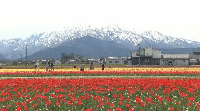 残雪の北アルプスとチューリップ200万本の競演“にゅうぜんフラワーロード”見頃 富山・入善町 2026年4月13日(月) 20:02 国内 13日の富山県内は青空が広がりお出かけ日和となりました。入善町では、見頃を迎えたチューリップが訪れた人たちを楽しませています。舟本真理アナウンサー「色とりどりのチューリップが今満開を迎えている、にゅう…