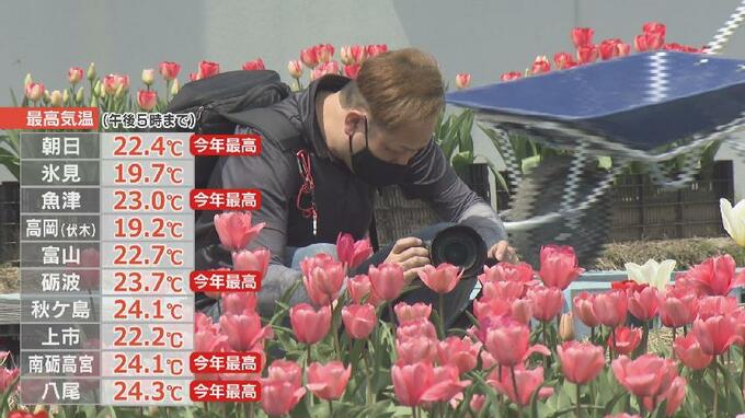 13日の県内は高気圧に覆われ、朝から青空が広がり、日中の最高気温は朝日で22・4℃、南砺高宮24・1℃など県内5つの地点で今年最高となりました。