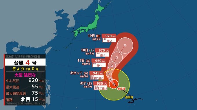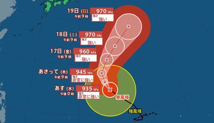 15日(水)正午には「非常に強い」勢力となり、引き続きマリアナ諸島付近をゆっくりと北北西に進む見込みです。中心気圧は935hPa、最大風速は50m/sと予想されています。