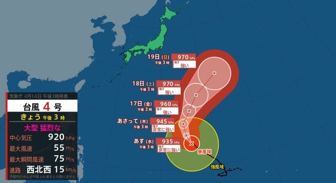 猛烈な勢力の台風4号は14日、マリアナ諸島付近を北西に進んでいます。中心気圧は920hPa、最大瞬間風速75m/sと非常に強く、17日以降は進路を北東へ変えて小笠原近海へ進む見通しです。