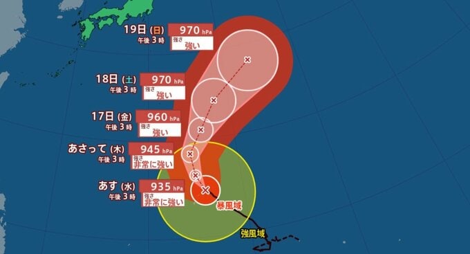 15日(水)午後3時には、台風は「非常に強い」勢力に変わり、マリアナ諸島をゆっくりと北に北西へ進む見込みです。中心気圧は935hPaまで上昇し、最大風速は50m/sとなる予報です。