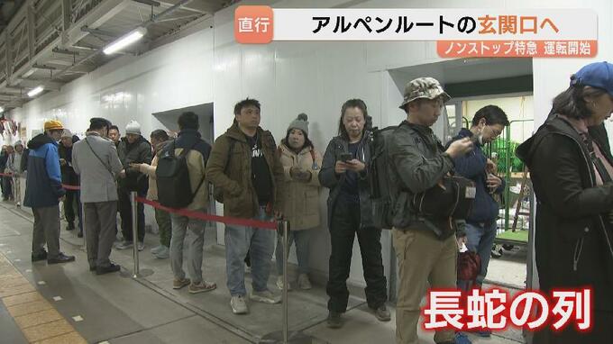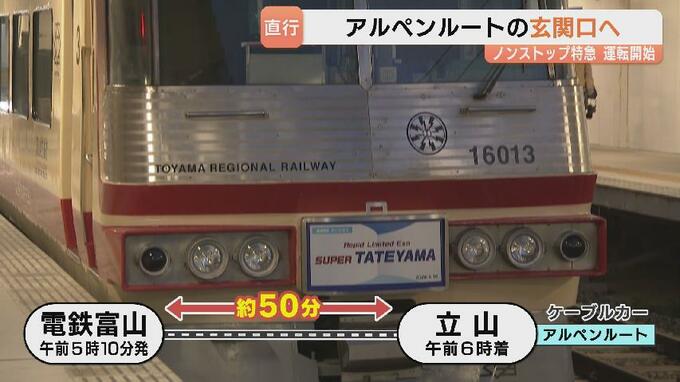 アルペンルートの全線開通に合わせ、富山地方鉄道のノンストップ特急「スーパーたてやま」の運行が15日始まりました。電鉄富山駅とアルペンルートの玄関口・立山駅を直行で結びます。初日は多くの利用客が駅に並び、期待に胸を膨らませていました。
