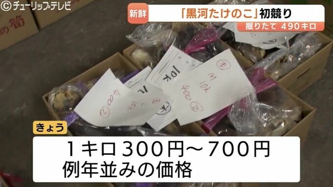 射水市黒河で行われた「黒河たけのこ」の初競りには、生産者が朝掘ったばかりのタケノコ490キロが並べられました。