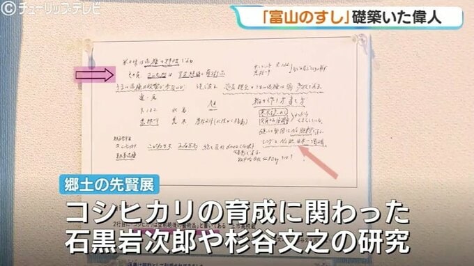 会場では「コシヒカリ」の育成に関わった石黒岩次郎や杉谷文之の研究、富山湾の「定置網漁法」を、国内外に普及させた酒井光雄など、農林水産業の礎を築いた人物の功績が詳しく紹介されています。