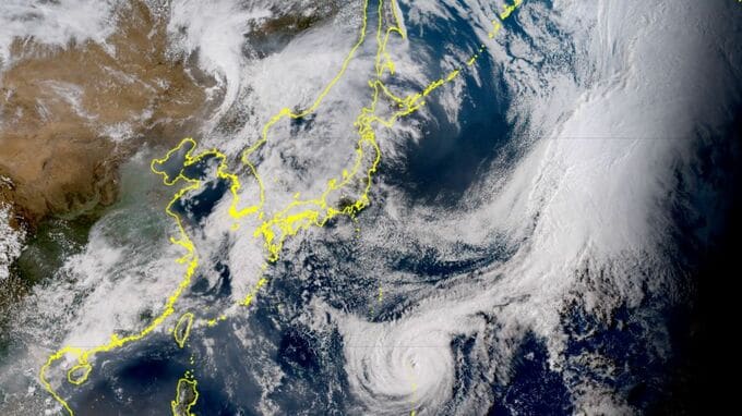 風速25m/s以上の暴風域は中心から半径220km、風速15m/s以上の強風域は半径600kmに及んでおり、広い範囲で荒れた天候となっています。