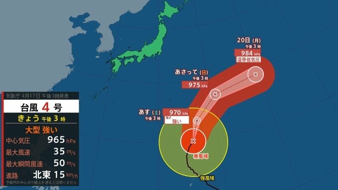 台風4号は17日、大型で強い勢力を保ちながらマリアナ諸島付近を北東に進んでおり、18日(土)には小笠原近海に達する見込みです。