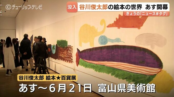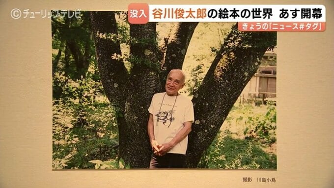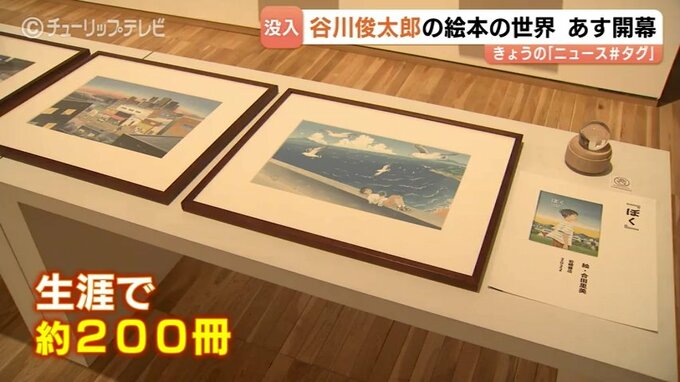 詩人、谷川俊太郎さんの絵本の展覧会があす18日から始まるのを前に関係者向けの内見会が行われました。