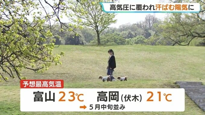 富山は5月中旬並みの陽気…最高気温23℃予想で汗ばむ一日に 1日を通して概ね晴れの見込み 2026年4月20日(月) 12:03 国内 20日の富山県内は概ね晴れとなっていて、日中の予想最高気温は富山で23℃と、5月中旬並みの汗ばむ陽気となりそうです。富山県内は20日、広く高気圧に覆われ概晴れの空模様となっています。朝の最低気温は富山で10.…