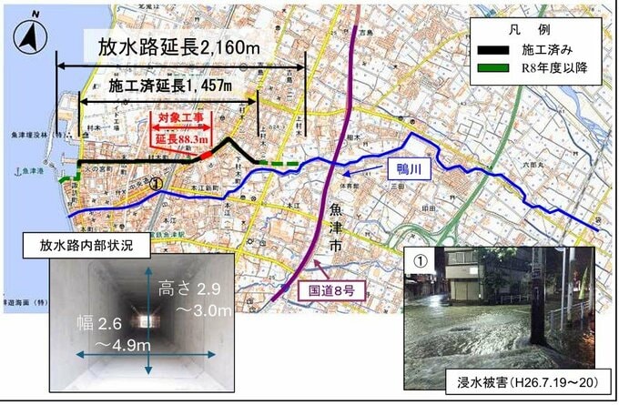 対象の工事は、洪水期に鴨川の水流を分散させて氾濫などの災害を防止するためのもので、ボックスカルバートとよばれる放水用の総延長約2,000メートルの中の、約88メートルの区間でした。