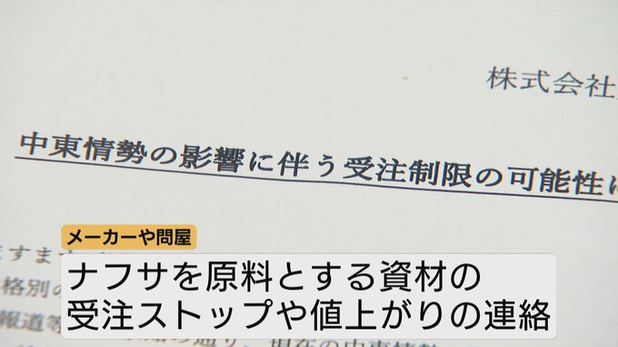 中東情勢の影響を受けて3月末から、会社には、住宅資材のメーカーや問屋から断熱材や基礎パッキン、屋根の雨漏り防止シートなど、ナフサを原料とするさまざまな資材の受注ストップや値上がりの連絡が届いています。