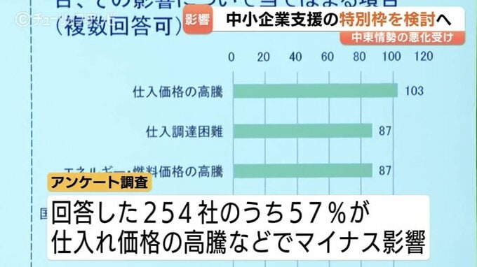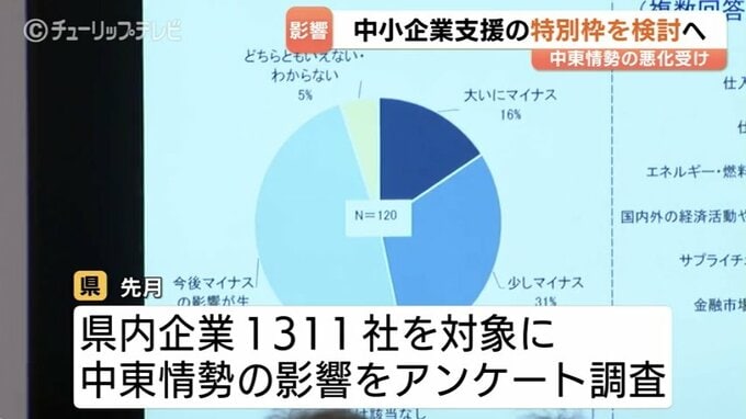 一方、県は3月、富山県内企業1311社を対象に、中東情勢の緊迫化による影響を把握するためのアンケートを実施していて、回答があった254社のうち57%が、仕入れ価格や燃料価格の高騰などでマイナスの影響が出ていると回答しているということです。