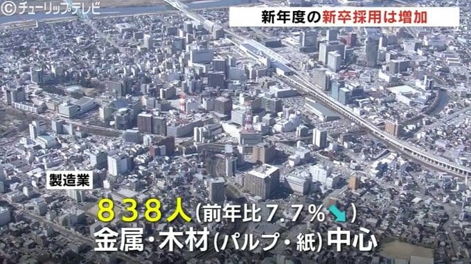 それによりますと、ことし4月の新卒採用は、前の年から3・4%増えて2016人でした。産業別では、製造業が「金属」、「木材・パルプ・紙」などを中心に7・7%減って838人。