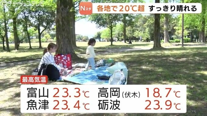 日中の最高気温は富山で23.3℃、魚津で23.4℃など、高岡市の伏木を除くすべての観測地点で20℃を超え過ごしやすい気温となりました。