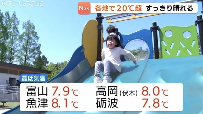 最低気温は富山で7.9℃、高岡市の伏木で8℃ちょうどなど、この時期らしい気温に。