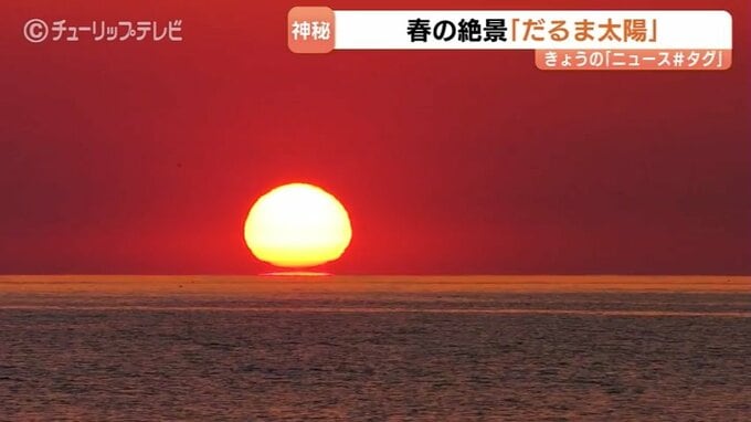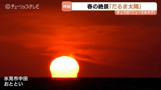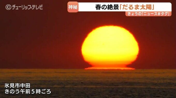 富山湾の春の絶景です。今月26日、富山県氷見市中田から見えたのは『だるま太陽』です。富山市のアマチュアカメラマン澤江弘一さんが撮影に成功しました。