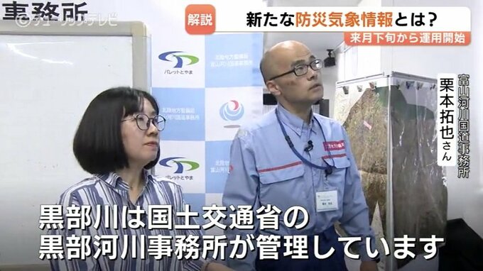 「小矢部川、庄川、神通川、常願寺川。黒部川は国土交通省の黒部河川事務所が管理してます。大雨が降った時にカメラの情報だとか、水位情報を監視しながら洪水に備える体制を担っている」